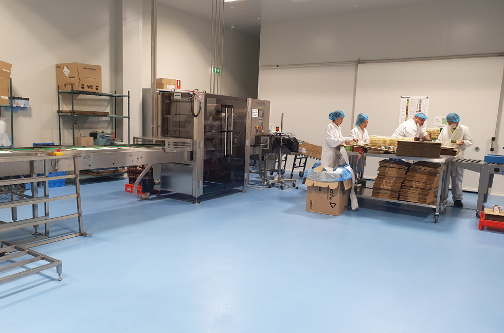 A selection of vibrant AS2700 custom colours was used to identify key zones. Homebush Gold was applied to the commercial kitchen, Marigold was selected for the Pasta Room and Bluebell was chosen for the freezer packaging area. The system was completed with Flowfresh Sealer which delivered an easy to clean, glossy platform underfoot.