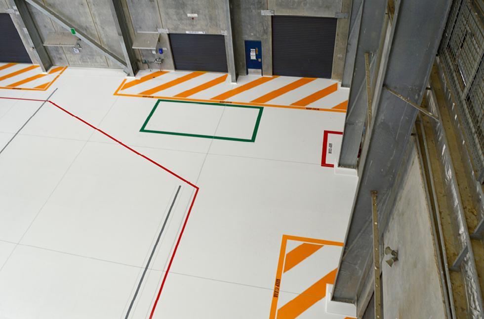 Line marking was later applied in contrasting shades of yellow, red and green to denote working zones and regulate traffic movement within the Aircraft Maintenance Facility.