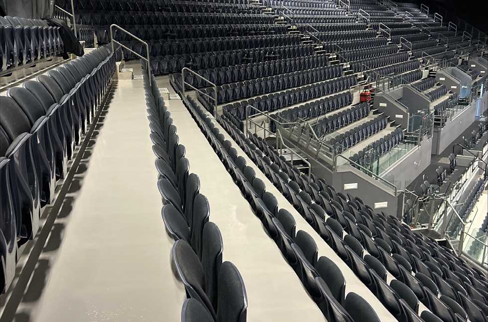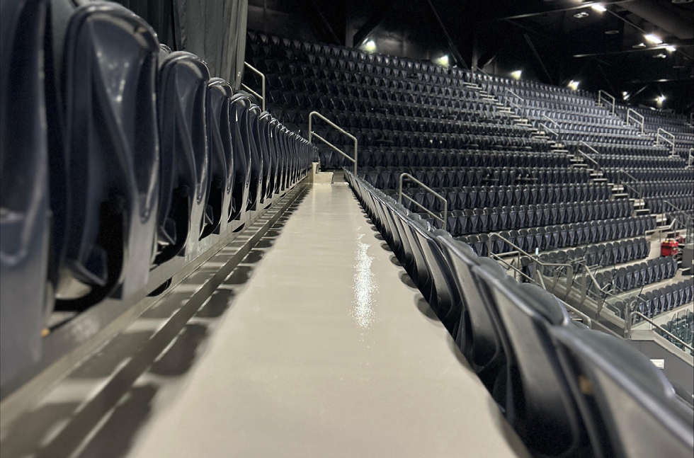 Flowcrete, in collaboration with Epoxy Flooring Ltd, recommended Flowcoat OP – a high-performance epoxy coating system designed for industrial and public use environments. Known for its excellent wear resistance and easy-clean properties, Flowcoat OP was the ideal solution to revitalise the bleachers while ensuring long-term performance. The system was installed in a neutral tone to provide a clean, uniform look across the seating area. Its seamless, non-porous finish helps prevent staining from spills and simplifies routine maintenance, an essential feature in a venue with fast turnaround times between events.