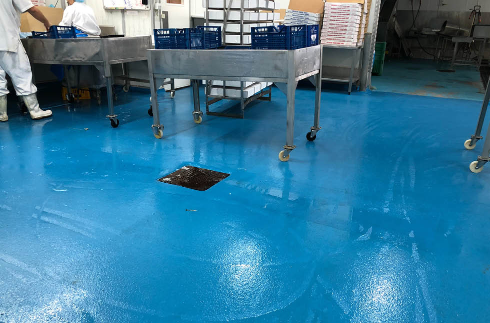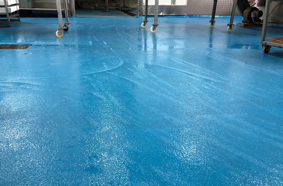 300 m2 of the robust polyurethane floor coating Flowfresh SR in a vibrant blue colour was applied thanks to its ability to provide a seamless, impervious and slip resistant finish. The durable nature of this system means that the floor will maintain its hygienic and functional properties for the long term. Flowfresh Sealer was used to complete the build-up and create a glossy, easy to clean surface.